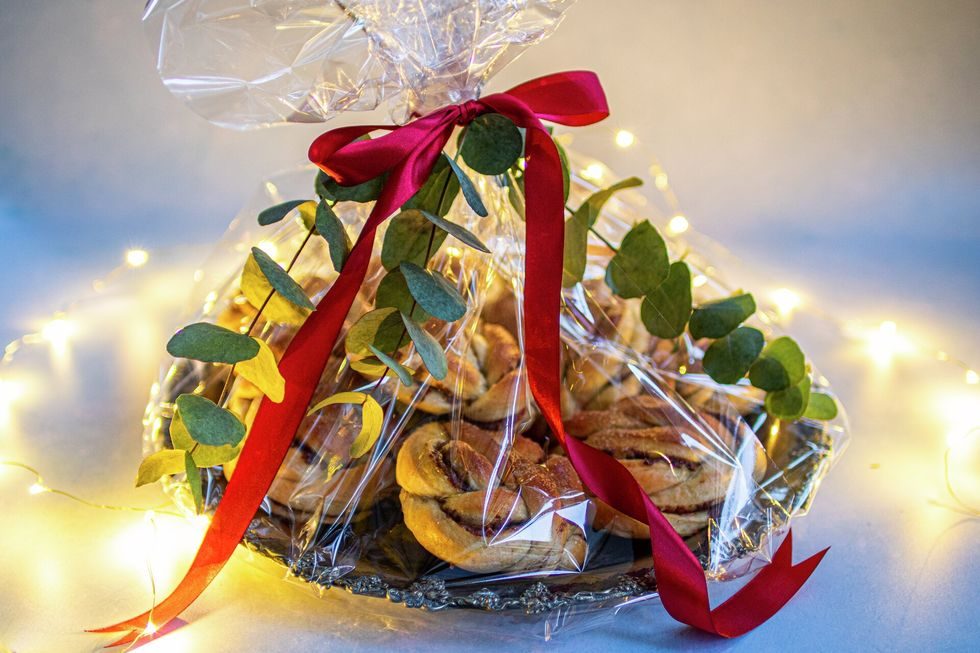 Til den gode nabofamilien du setter pris på: Søte kanelknuter på fat med cellofan, rødt silkebånd og eukalyptuskvister.