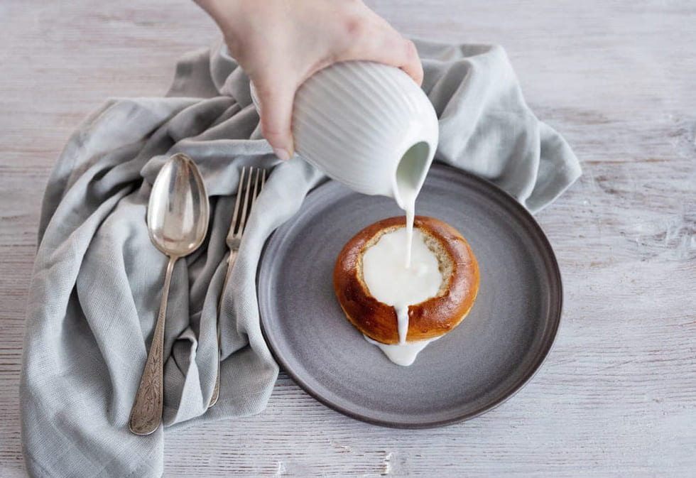 Hetevegger lager man ved å legge en hvetebolle i en skål og helle over varm melk som er kokt sammen med smør, sukker og kanel. (Foto: Norgesmøllene)