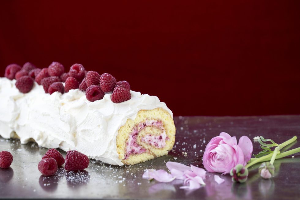 4.rullekake med bringebær og krem