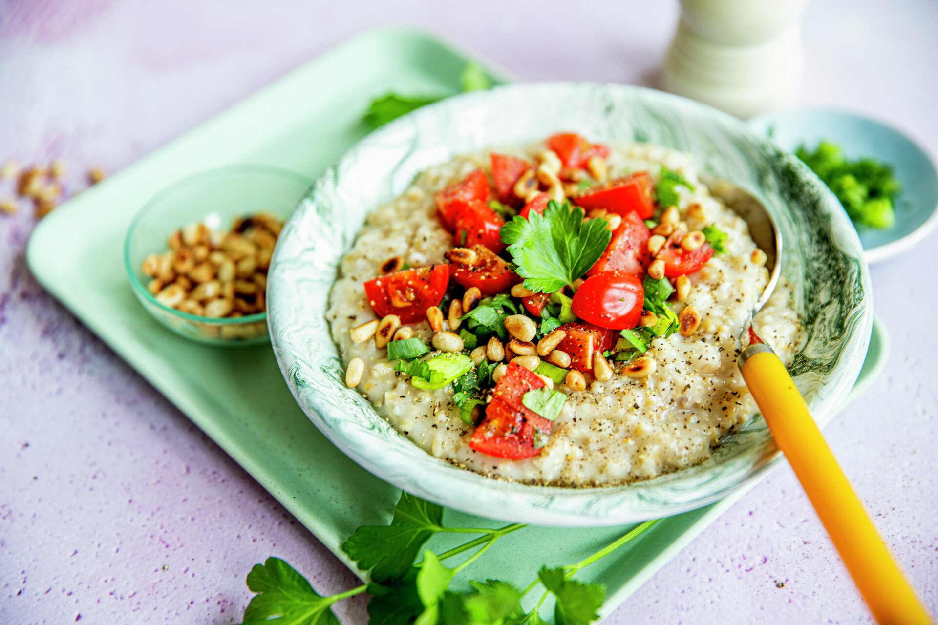 Steel cut havregrøt med tomat og urter, klikk på bildet for oppskrift.