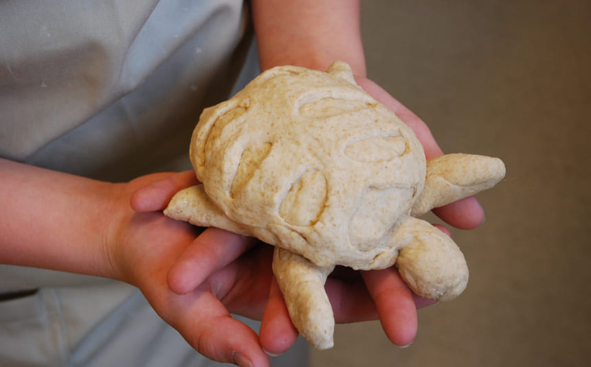 Trill en liten og en stor kule til skilpaddens hode og kropp. Form fire kjegleformede ben og en mindre kjegleformet hale. Skilpaddeskallet lager du ved å trykke ut hull i en flat, rund deig med eggeglass.