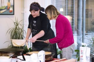Ingrid Lamark og Mari Gjengedal fra Bygdekvinnelaget demonstrerte prosessen fra deig til ferdig lefse og sørget for at beboerne kunne få bake selv eller bare se og nyte opplevelsen.