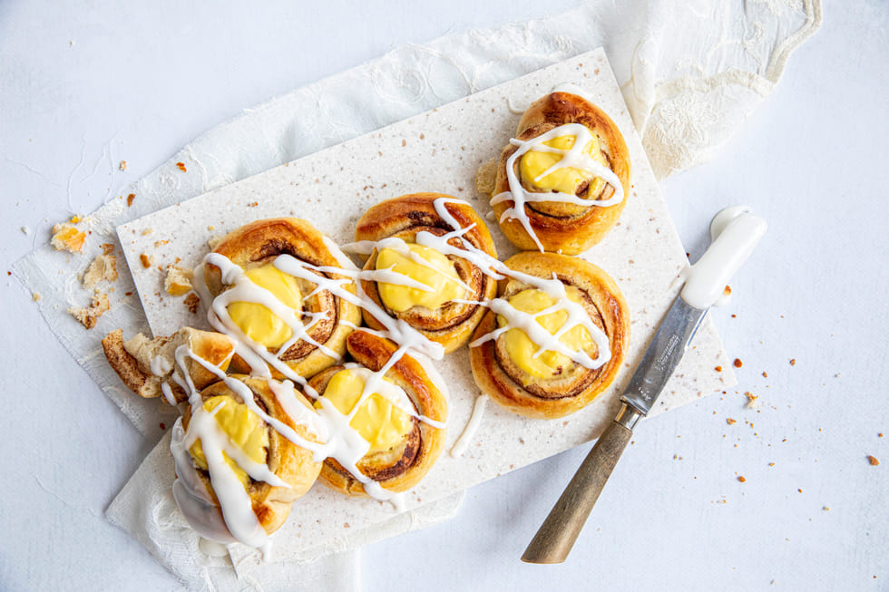 Lenger sør i Norge forbinder mange solboller med disse solgule hvetebollene med kanel og vaniljekrem.