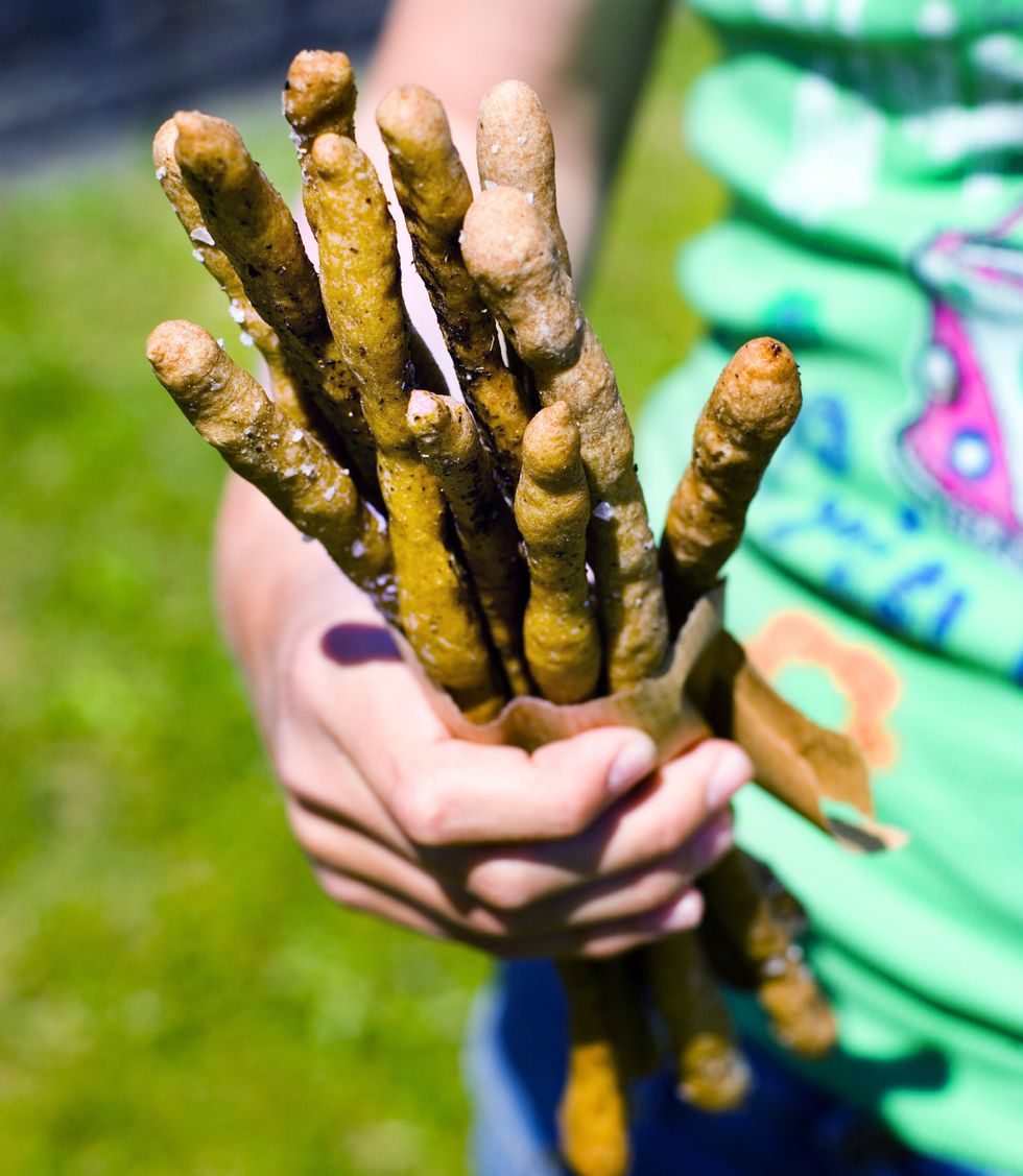 Pinnebrød er hvetedeig du surrer rundt en pinne og steker på grill eller på bål som turmat. Her er en gourmetvariant med chorizopølse og basilikum
