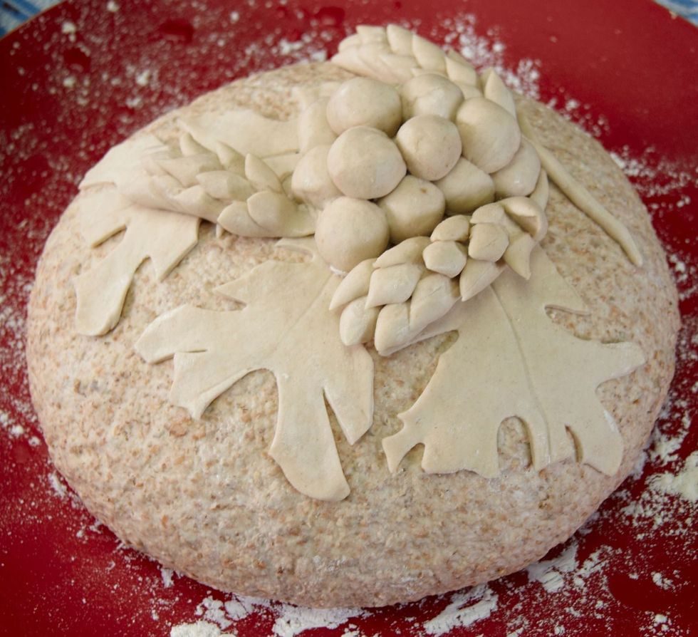 - Del deigen i tre emner. To store og ét lite. Form to runde brød av de store emnene. Kjevle ut det minste emnet til det er 1 centimeter tykt, og skjær ut bladformer med en spiss kniv. Rull små kuler til drueklasen. Hvis du pensler dekoren med vann før du legger den på brødet sitter den bedre.