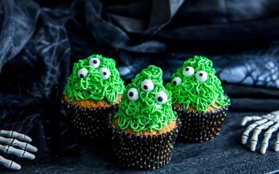 Gresskarmuffins med farget sjokoladekrem som ligner små monster pynter opp på kakebordet til halloween-festen. Skummelt godt for store og små!
