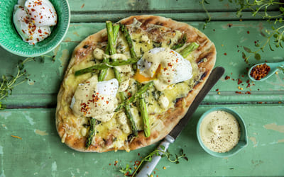 En lett sommerpizza du lager på grillen, med ny og spennende topping: Posjert egg, asparges og hollandaise.