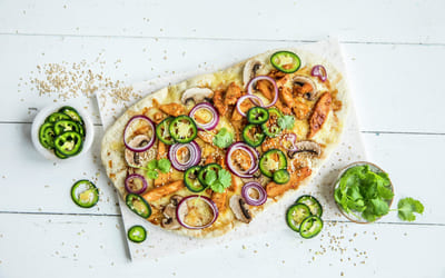 Denne pizzaen blir kjapt familiens yndlingspizza. Topping med bbq-kylling, rødløk, sopp, spicy jalapenõ og frisk koriander gir spennende smaker.
