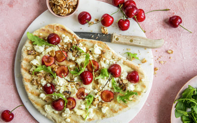 En spennende sommerpizza med moreller, fetaost, honning og valnøtter. Tilberedt på grillen får den deilig og sprø bunn.