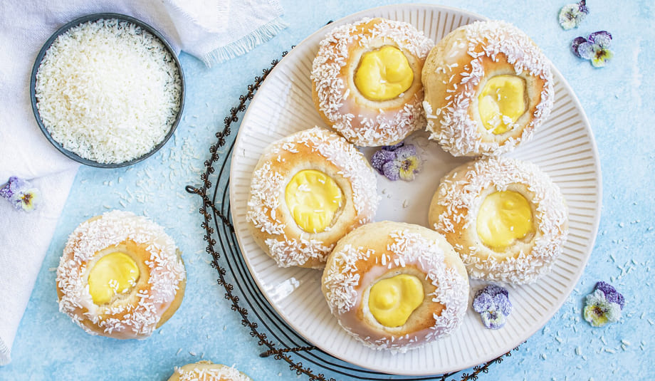 - Når de er blitt kalde, smør med melisglasur og dypp dem i en skål med kokos.