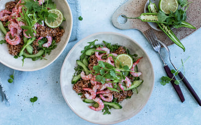 Skalldyrsalat med byggris er en deilig, smakfull og mettende sommersalat med ruccula, avokado, slangeagurk, reker og chilisaus. Passer til lunsj eller lett middag.
