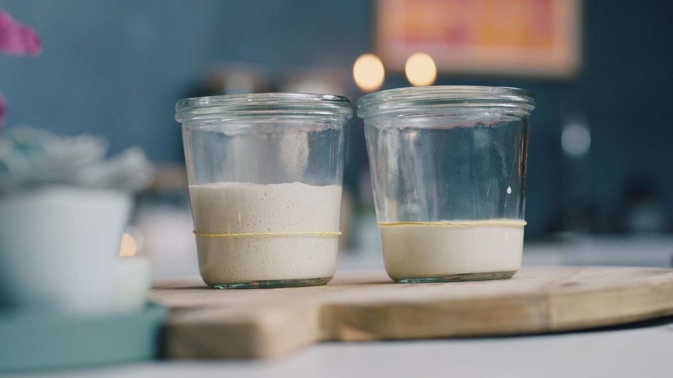 Den første blandingen av mel og vann kan du for eksempel ha i et syltetøyglass med noen hull i lokket. Det er nemlig viktig at surdeigstarteren får puste litt. Etter et døgn eller to vil du se at det har formet seg bobler i røren, og dette er et tegn på at den nå er klar for påfyll av litt nytt mel og vann.